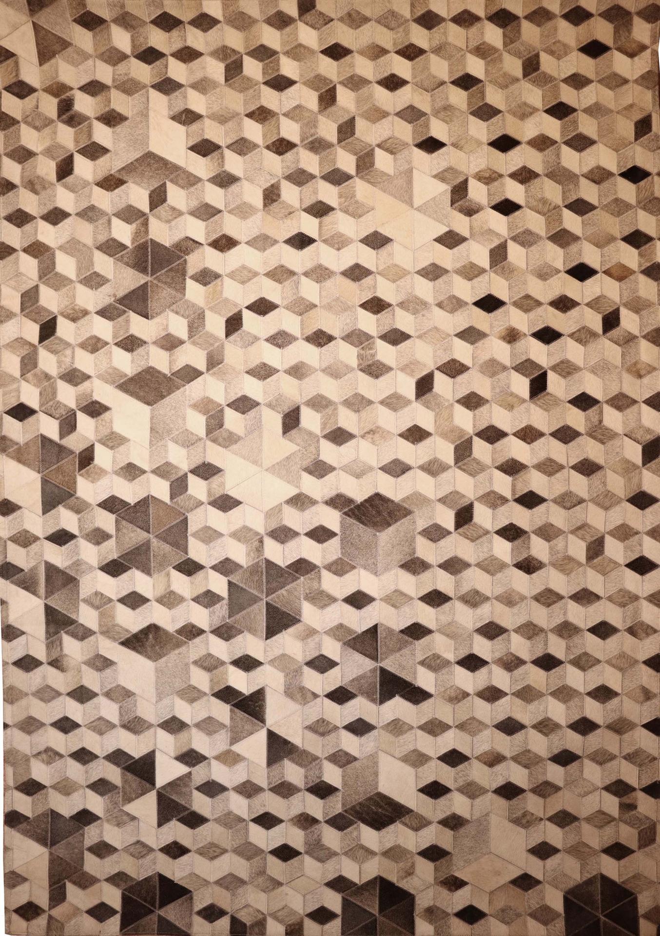 Ces tapis à dessins géométriques sont composés de pièces de cuir de vache, assemblée les unes aux autres et doublés d'une couche de feutre. Ils donnent une touche moderne et chaleureuse à votre intérieur.